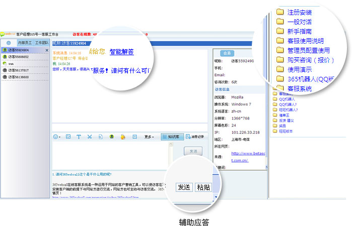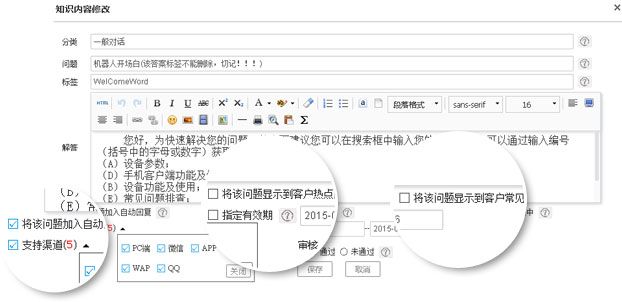 365webcall智能知識庫全媒體接入,統一管理、智能解答、熱點問題、常見問題、人員權限管理。